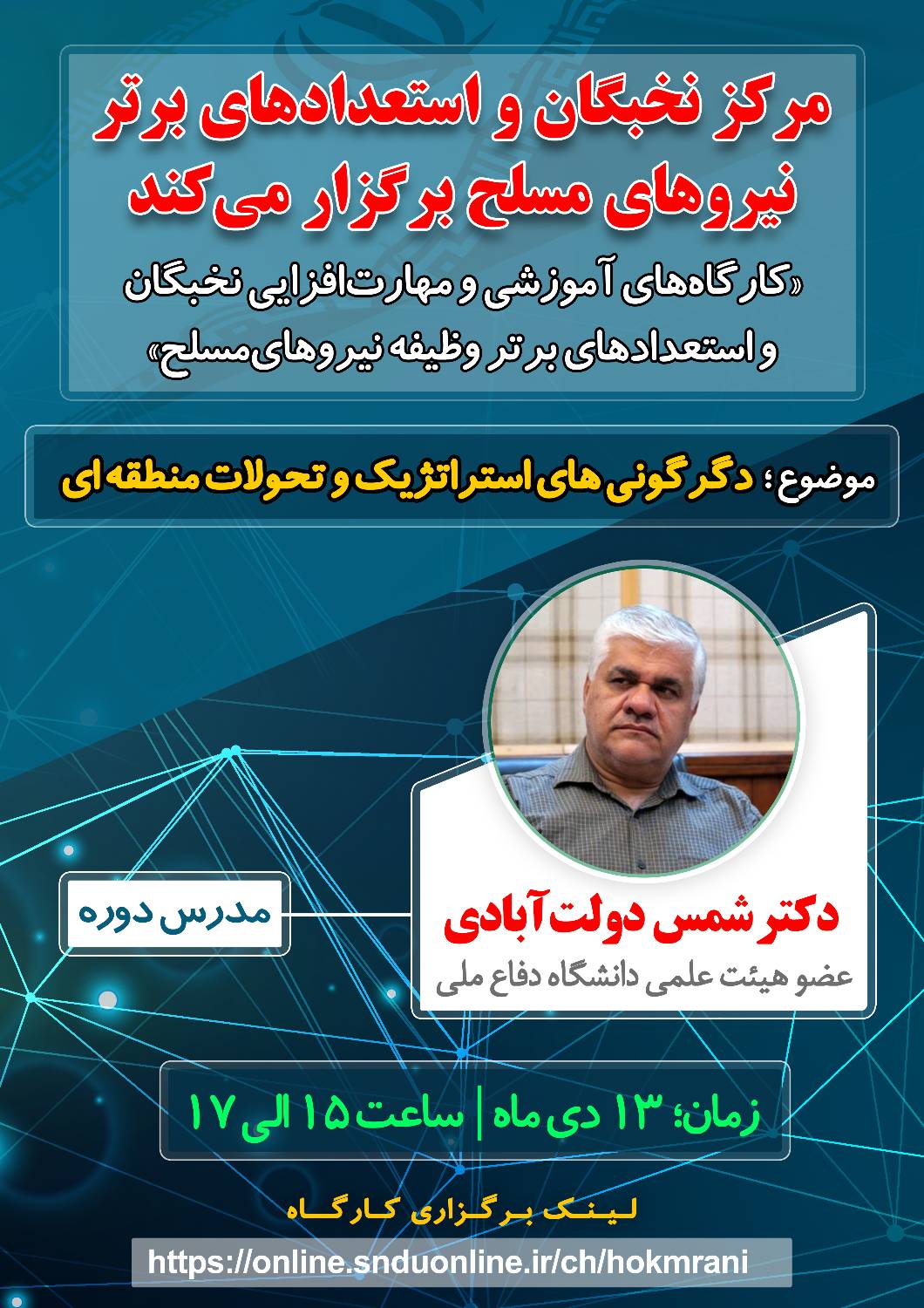 در مرحله نخست، با توجه به تحولات منطقهای و بینالمللی، از دکتر شمس دولتآبادی (عضو هیئت علمی دانشگاه عالی دفاع ملی) دعوت شده است تا در خصوص دگردگونیهای استراتژیک و تحولات منطقهای به ارائه بحث بپردازند.